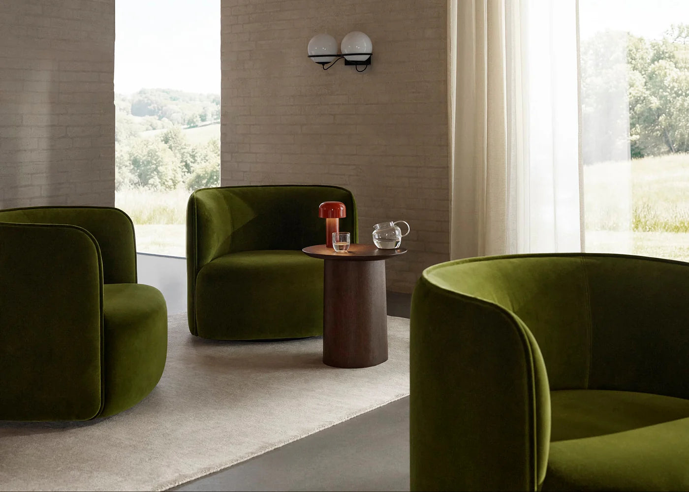 Shaped by a gentle curve, the Panorama Lounge Chair reflects Jonas Wagell’s approach to simplified form and balanced proportion. Its continuous backrest creates a welcoming sense of enclosure, while the fully upholstered silhouette settles visually into the floor, giving the chair a calm, grounded presence. Slender proportions and subtle piping sharpen the outline, adding lightness and quiet precision to the generous volume.